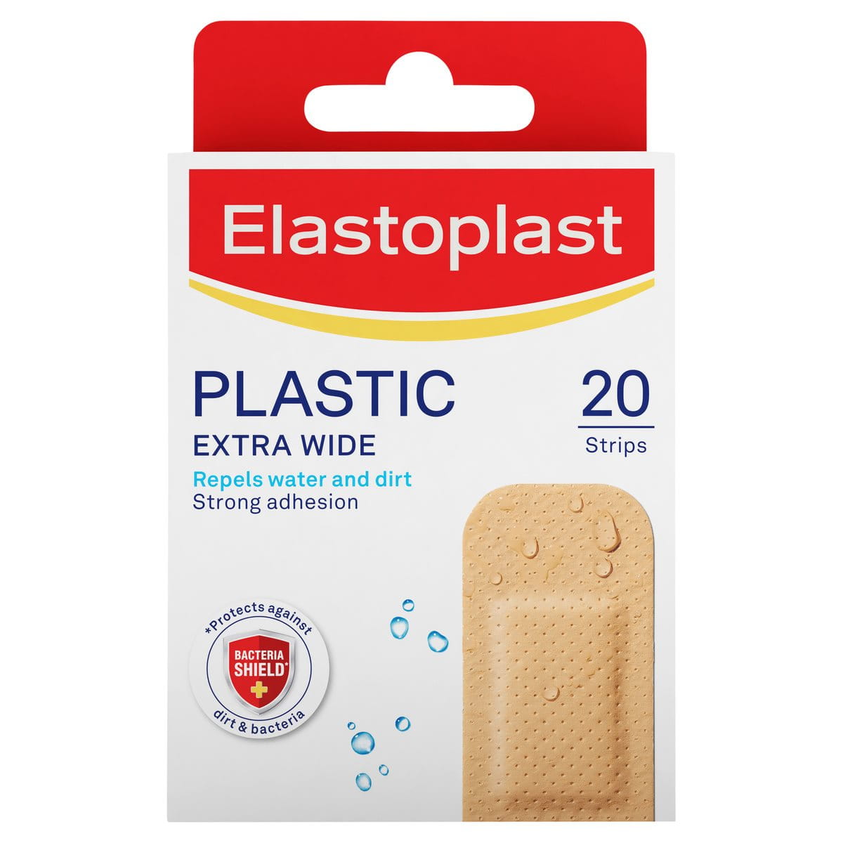 Elastoplast Water Resistant Plastic Wide Strip Plasters with Elastoplast Bacteria Shield* are suitable to cover and protect all types of minor, everyday wounds. The material is breathable and water-resistant to help protect your wound from moisture and water, whilst the non-stick wound pad is designed to protect and cushion the wound. The strong adhesion ensures that the plaster stays in place, making them appropriate for use over joints and other moving parts of the body. The plasters are available as strips in different sizes which seal all around the wound, and as a dressing length which can be cut to the ideal size. Only for small wounds, minor cuts and grazes. Apply the plaster without stretching to achieve best results. The plaster also contains 0% latex.